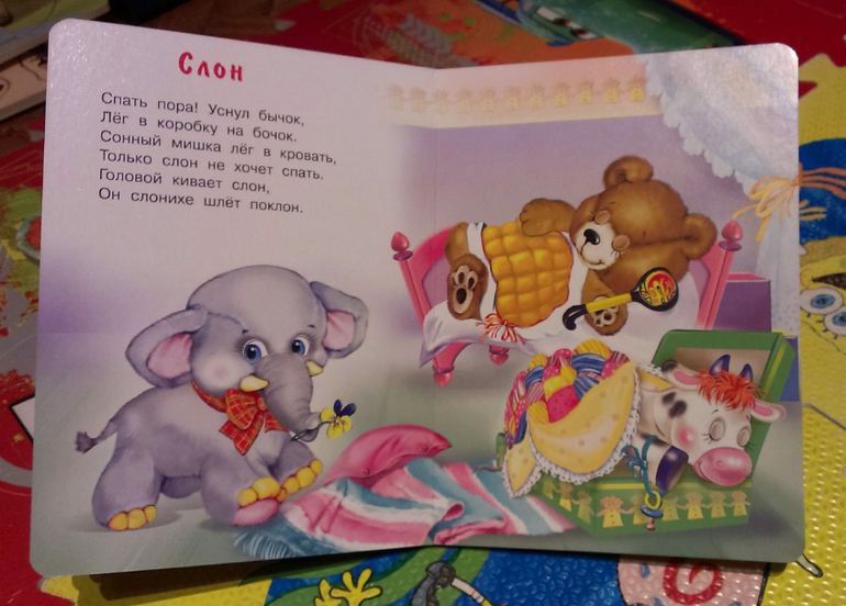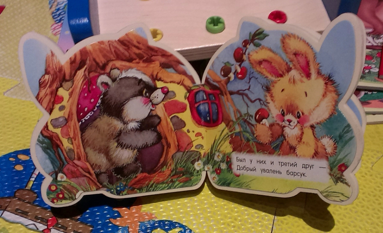 В целом книжка как подарок достаточно интересная, но если рассматривать первоочередную задачи книги-чтение, то здесь увы и ах- текста очень мало, но зато иллюстрации сделаны на совесть. Эта книжка-малютка, помещается во взрослую ладонь, за счет очень толстых вспененных страниц ребенку легко перелистывать, на зуб кстати очень понравилась :)