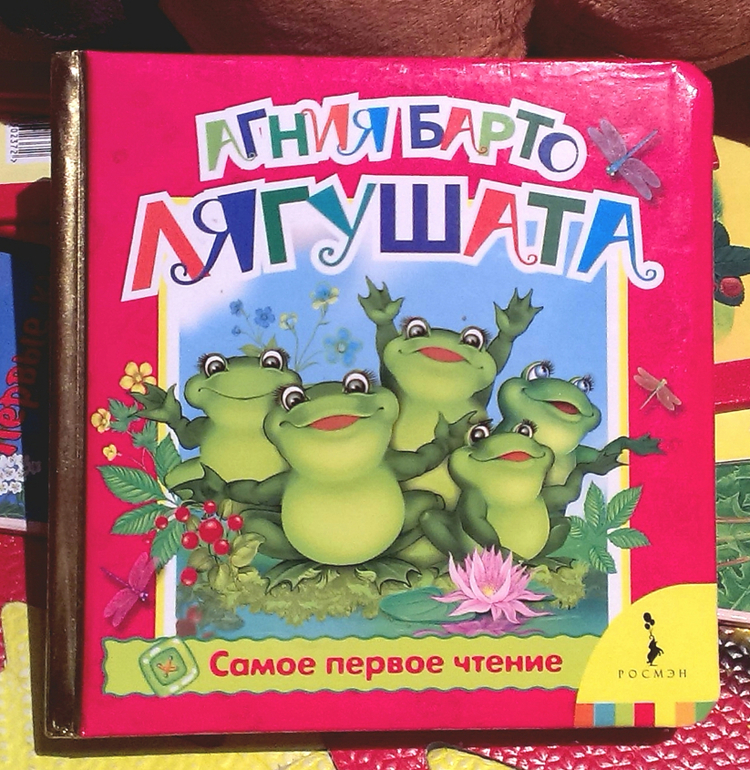Также на нашей полочке появился сборник "Лягушата" изд. Росмэн-пресс Серия "Самое первое чтение". В данный сборник вошли следующие стихи: Лягушата, Сонечка, Барабан, Сторож. Книжка пухленькая, страницы из очень плотного картона, антивандальные, ребенку согнуть или порвать практически невозможно.