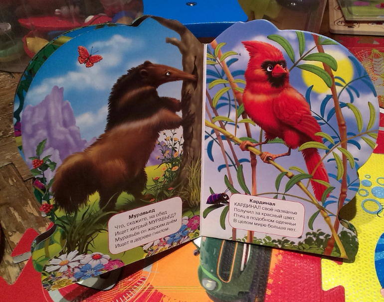 По наполнению книга достаточно информативная, несмотря на минимум текста: перечислены домашние любимцы (каждая картинки подписана), отдельный разворот для кошек (что едят, где какие части тела), породы собак, а также другие дикие и домашние животные и птицы, насекомые и пауки, различные информативные развороты (кто чем полезен человеку, обучение счету с помощью бабочек, задания кто что ест и где живет, кто как передвигается). В принципе очень полезная и обучающая книжка с минимумом текста и максимумом реальных изображений, а не компьютерной графики. Ребенок книгу рассматривает с удовольствием, странички достаточно плотные-погнуть так просто не удастся, обложка тоже очень приятная на ощупь. Иногда даже едим с ней. В дальнейшем планирую докупить некоторые книги из данной серии.