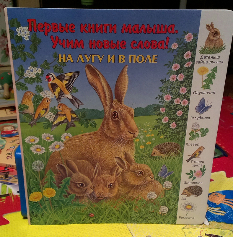 Еще одна книга из разряда гляделок - "На лугу и в поле" из серии "Первые книги малыша. Учим новые слова!" пер. Д.М.Комаровой изд. "Улыбка". Эта книга была куплена мною после прочтения многих хвалебных отзывов как на ББ, так и на других сайтах, в т.ч. книжных интернет- магазинах. Ну что я могу про нее сказать? Не пошла пока у нас эта книга, видимо не доросли еще, не готова дочка наверно кропотливо искать крота или плоды боярышника. Я думаю придет еще ее время, т.к. мне самой (и свекрови кстати тоже) было довольно интересно поискать некоторых из животных и растений. К тексту претензий никак нет- это проза довольно простая и понятная, описывающая что происходит в поле, на некоторых страницах есть вопросы и задания для ребенка. Итог таков- занимает ребенка не больше других книжек, но с каждым днем все больше проявляет к ней интерес.