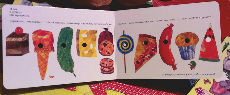 В продолжение темы прорезей- Эрик Карл "Очень голодная гусеница". Куплена была из-за восторженных отзывов на ББ, прям лучшая книга для детей на протяжении 40 лет. Не могу сказать, что ребенок часами с ней зависает и пищит от восторга. Да конечно дочке интересно перелистывать странички разного формата и совать пальчики в дырочки, на этом все. Видимо не пришел ее час :( Поэтому ждем писка и счастливых визгов от этой книги.