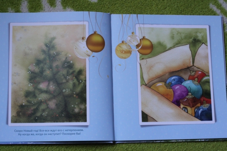 Книга большая, почти квадратная (29х27см). Обложка немного бархатистая с легким рельефом - ощущение мягкой акварельной бумаги. Бумага плотная, мелованная.