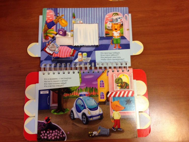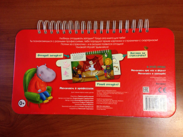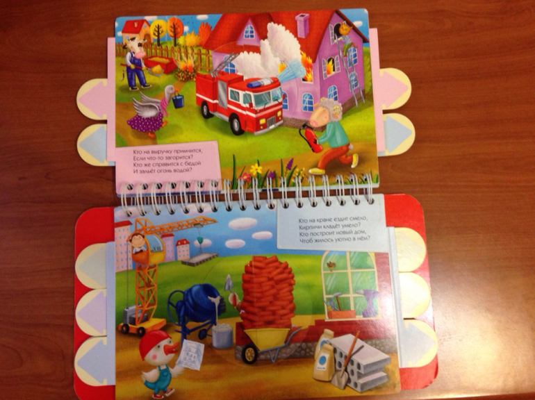 Наше открытие! Посоветовали нам в книжном магазине. Нике понравилось, купили. Первые пару-тройку дней играли очень активно. Сейчас реже, но всё равно достаем, читаем. Книга знакомит малыша с самыми распространенными профессиями: врач, полицейский, пожарный, строитель, повар, продавец, художник, балерина, парикмахер и учитель. Также к каждой профессии есть подборка основных атрибутов. На каждой странице есть загадка, которую очень просто разгадать, стоит лишь потянуть за язычки сбоку. Кстати, с помощью этой книжки можно приучать ребенка и к игре в находили. Как раз подойдет как первый этап. Но предупреждаю, не все атрибуты профессий есть на основном рисунке. Исполнение книги понравилось. Картон очень плотный и вообще качество на высоте! Язычки крупные и двигаются легко. На фотографиях есть все страницы книги.