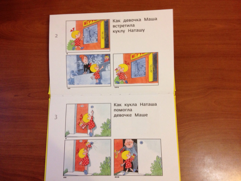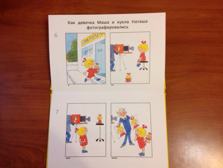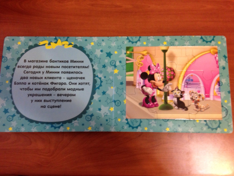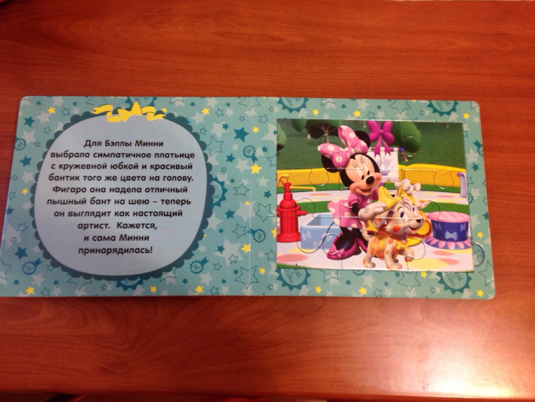 Нам ее подарила бабушка, т.к. Ника очень любит Минни и Дейзи. Текст никакой, но вся соль книги в пазлах. Ника не очень любит пазлы, а эти собирает с удовольствием! Так что мы книгой довольны. Качество кстати хорошее очень! Картон плотный, детали разъединяются хорошо. На фото есть все развороты-их всего 4. На мой взгляд, покупать стоит только поклонницам Минни Маус, вдруг здесь есть такие. )
