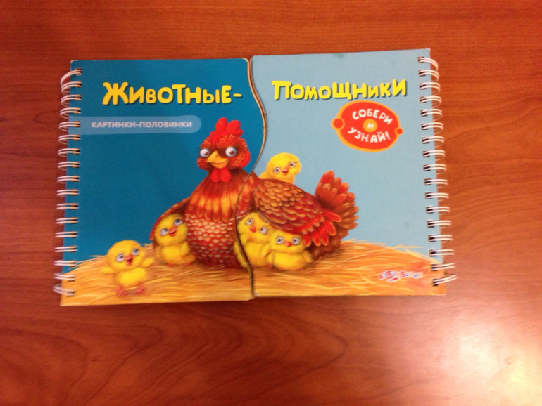 Это что-то вроде пазлов для малышей. Нужно собрать животное из двух половинок. Если собрал правильно, можно увидеть, чем это животное питается, где живет, и какие у него дети. На каждом развороте есть небольшой стишок в одно четверостишье. Нам бабушка подарила книгу в полтора года. Ника сразу заинтересовалась, но не получалось собирать у нее. Я переворачивала странички, а дочка пыталась угадать, правильно ли я собрала то или иное животное. Теперь Ника уже сама собирает. Не скажу, что книга у нас хит, но как один вариант занять минут 15-30 вполне ничего.