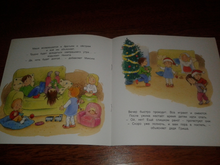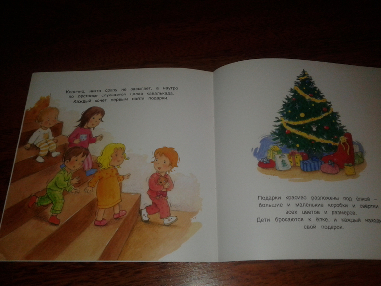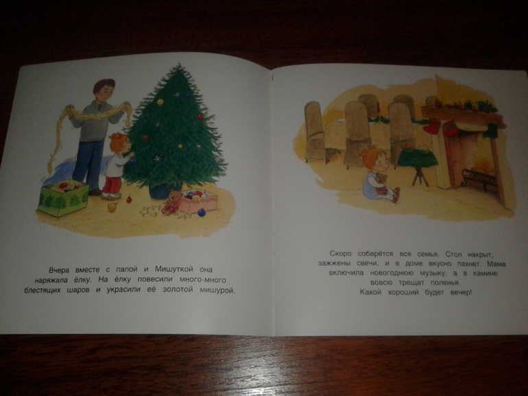 Эта книга в мягкой обложке за 64 рубля (в kniga.ru) настоящая находка для 2ухлетки. В ней легко и наглядно объясняется весь процесс приготовления к празднику - как Маша наряжается, помогает папе наряжать елку, встречает гостей, как все веселятся, но вот приходит время спать - дети размещаются в детской, а наутро находят под елкой подарки. Скоро начнем читать.