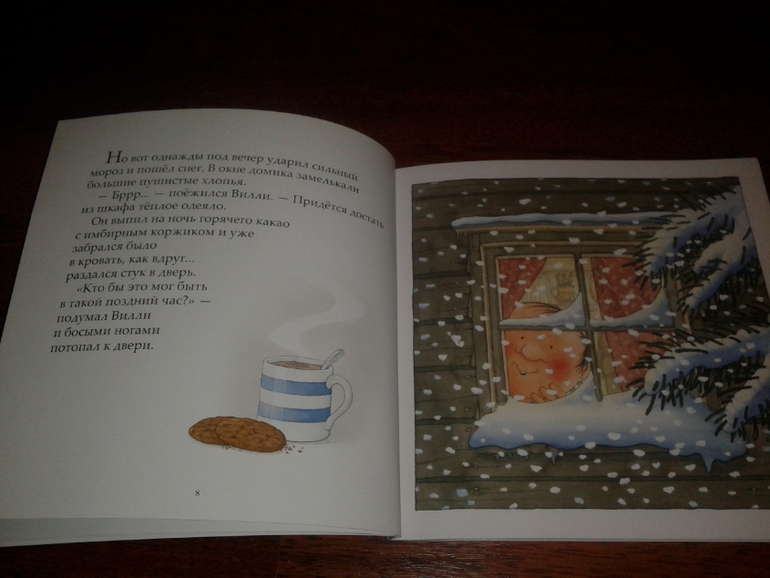 Это одна из книг серии о дяде Вилли. Дядя Вилли - сторож в парке. Он кормит животных, ухаживает а растениями, дорожки метет. А живет в сторожке, где у него уютно и тепло. Однажды зимней ночью шел снег и сильно похолодало. К дяде Вилле в сторожку стали приходить животные - они просились переночевать - зайки, лиса, белка, барсук и др. Дядя Вилли всем дал приют.