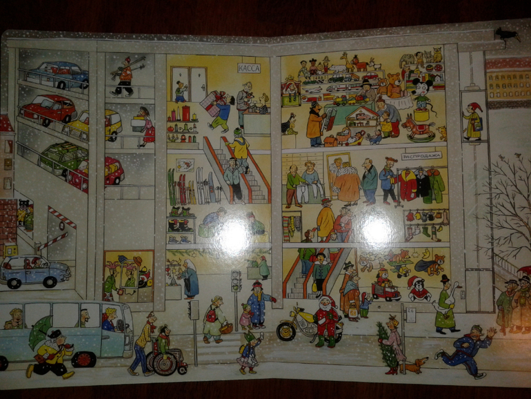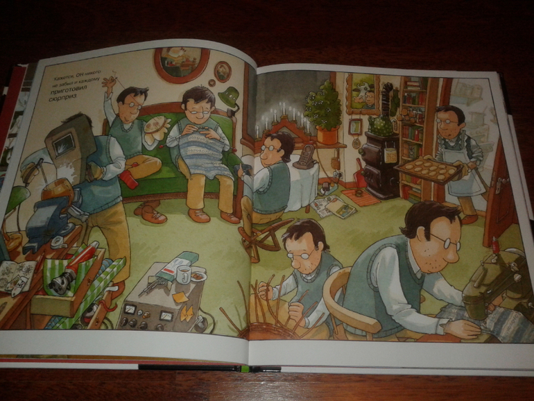 Задумка и исполнение шикарны. За одним минусом - нет глубины, объема так сказать в изображениях (надеюсь все поняли, что я имею ввиду). Кстати, посмотрите на фото ниже - да,да, там Санта Клаус мотоциклист. Он едет в шлеме на каждом развороте, и лишь в конце книги мы узнаем кто этот загадочный мотоциклист!