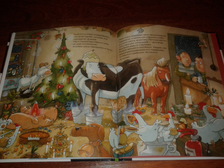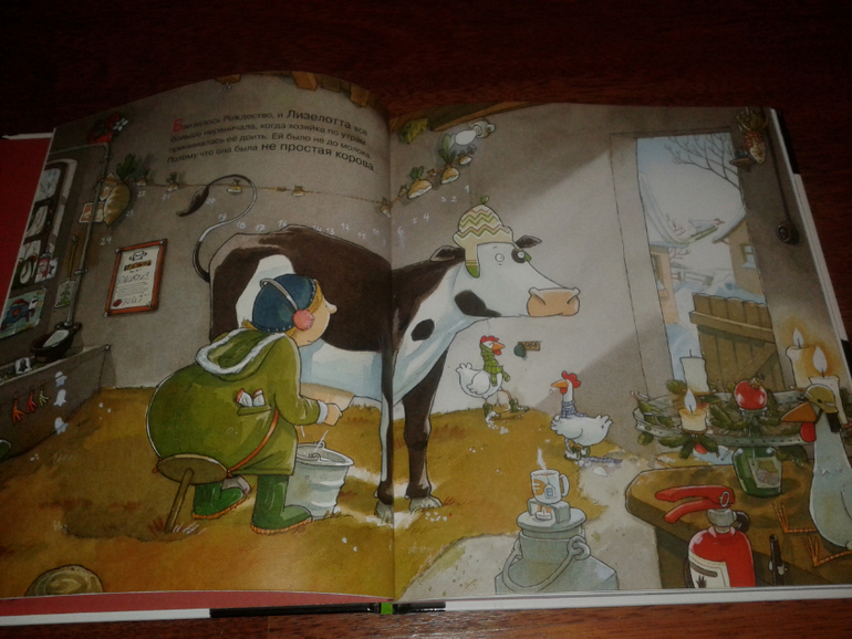 Это книга о корове Лизелотте. Она не простая корова, а почтовая. Она помогает почтальону разносить письма и посылки. В этот раз они разносят рождественские подарки. Очень ответственное занятие. Но Лизелотта немного заблудилась, поскиталась и пришла домой к своей хозяйке. А сам почтальон неровно дышит к хозяйке:) Он приготовил ей и и всему скотному двору подарки на паздник. Но герои книги распределили между собой эти подарки совсем не так, как это было задумано. Тут хороший момент на внимательность - есть что обсудить с ребенком.