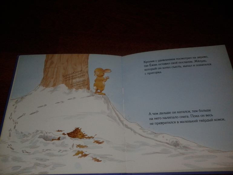 Но в итоге Кролик, конечно, сохранит ёжику кусочек зимы - комочек снега. Вернее, сначала это будет большой снежный ком, который кролик старательно завернет в листья и спряет, но к тому времени, как кролик проснется останется маааленький комочек.