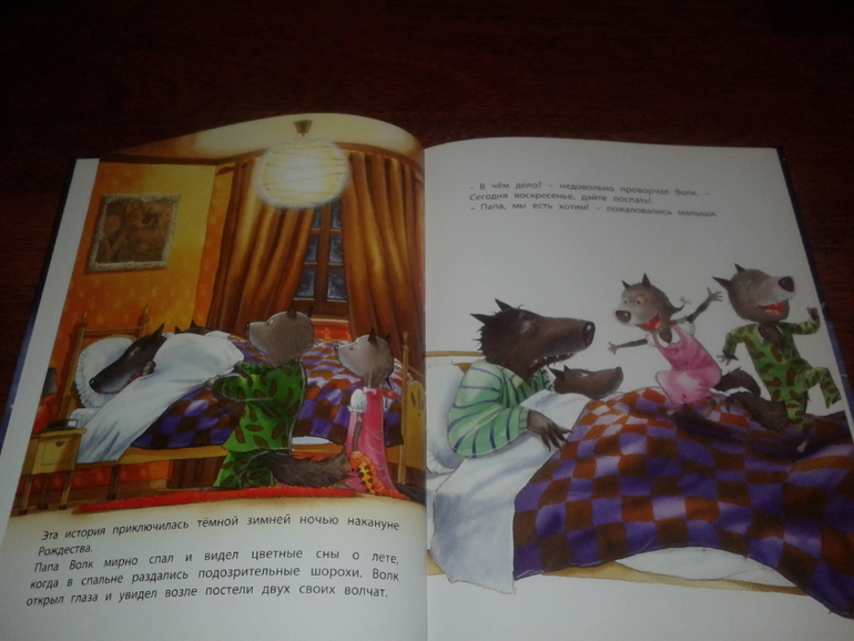 Это история про папу волка, который пошел добывать обед своим волчатам. Он хотел принести им им мяса, но жалел всех, кто встречался ему на пути - у кого-то тоже дети голодные сидят, у кого-то мама болеет (а у Волка тоже есть старенькая мама), он даже пожалел оленя Санты, ведь он не мог представить, что дети останутся без подарков.