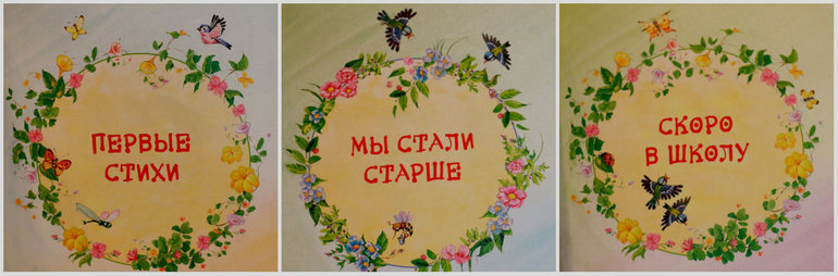 Честно говоря, деление на разделы выглядит несколько искусственным. Принципиально отличаются лишь «Первые стихи», где есть самые простые четверостишья Агнии Барто и «звукоподражательные» стихи Андрея Усачева. Размещение большинства других стихов, на мой взгляд, весьма спорно. Это, пожалуй, единственная странность в книге. Да, и так уж ли это существенно, ведь для маленького слушателя это вовсе не важно. Важно, что в книге собраны проверенные временем стихи Бориса Заходера, Даниила Хармса, Саши Черного. Есть и другие стихи менее растиражированных авторов. Что лично меня только радует.