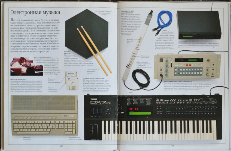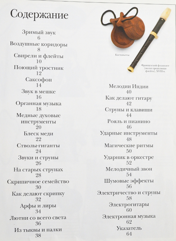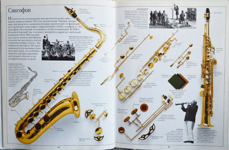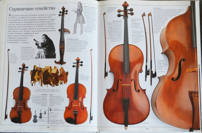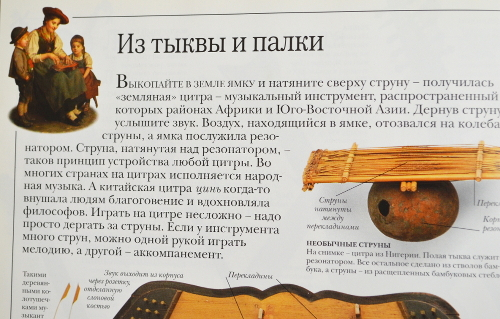Минусы у издания, конечно, тоже есть. Электронные музыкальные инструменты представлены старыми моделями (энциклопедия переводная, оригинал вышел в 1989 г.) Совсем ничего нет про симфонический оркестр (хотя бы разворот с рассадкой музыкантов!). Ну и ни слова о музыкальных жанрах, ладах и прочей теории. Впрочем, последние минусы можно объяснить форматом издания - энциклопедия небольшая и скорее вводная. То есть понемножку о главном.