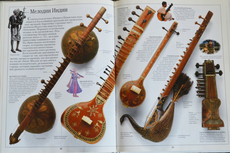 На каждую тему отводится разворот. Немного теории, краткое описание инструментов. Фактов минимум, ничего сложного - ровно то, что нужно, чтобы вспомнить или узнать основы работы музыкальных инструментов (мне самой было интересно читать). Инструменты представлены разные - и классические духовые, струнные, клавишные, ударные, и этнические. Есть, например, строение пианино или разобранный саксофон. И картинки о том, как делают скрипку и гитару.