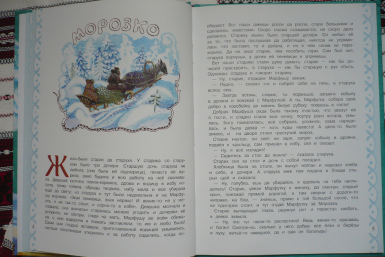 Книгу купила для сына. Он уже на протяжении месяца интересуется сказкой "Морозко". Читаем ее часто, постоянно рассказывает из нее отрывки. У нас есть эта сказка в разных пересказах (в другом варианте А. Афанасьева, в обр. М. Булатова, А. Толстого) и с разными иллюстрациями (П. Пономаренко, Н. Носкович, Ю. Коровина).