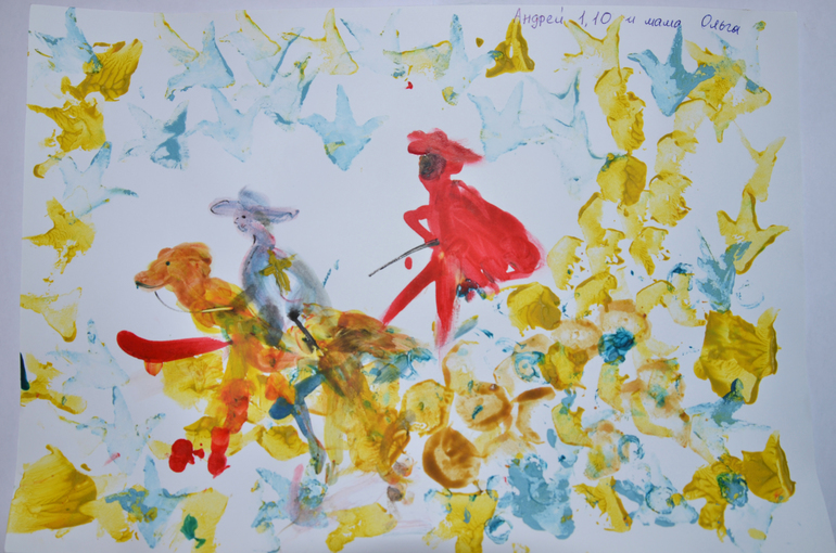 Но тут каким-то чудом он умудрился нарисовать что-то похожее на фигуру в шляпе, даже нога получилась! Я воспрянула духом и его пальчиком дорисовала мушкетеру плащ, красному зигзагу - плащ, ноги и шляпу, и получилась у нас чудо-картина:)) Ура! Зубочисткой от себя нарисовала глаз Д"артаньяну, лошади глаз и уздечку, и шпагу гвардейцу. Название сложилось само-собой: «Гвардеец кардинала подло нападает на Д'артаньяна»