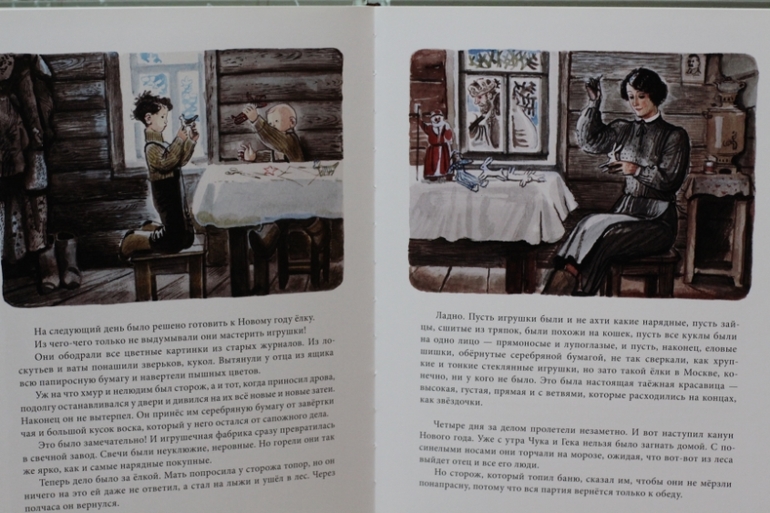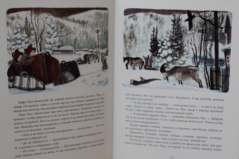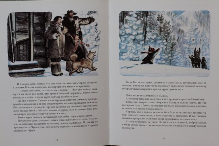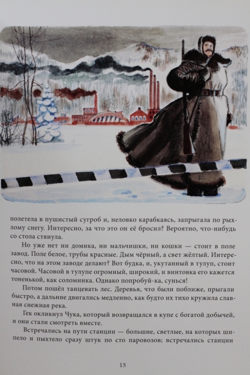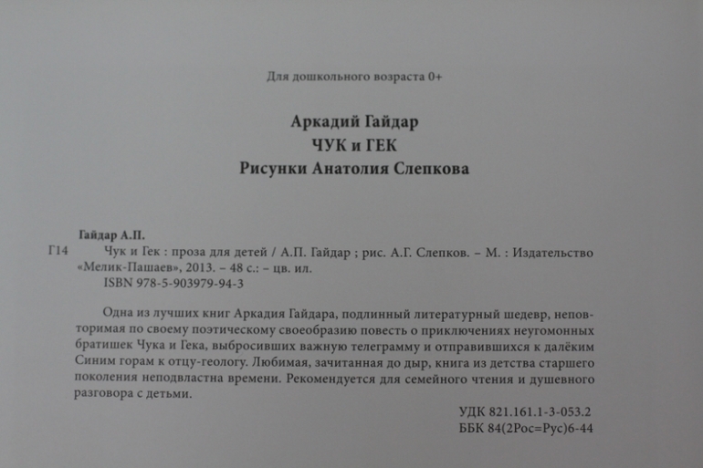 Чук и Гек. А.П. Гайдар, Издательство "Мелик-Пашаев", 2013год Книга большого формата (28х22см), напечатана на плотной мелованной бумаге. Шрифт комфортный для чтения лет с 7-8, разворотов без иллюстраций всего 2 на 48 страниц.