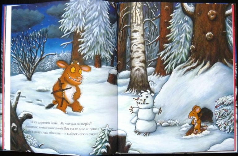 ...В соседний лес нам ходу нет, опасен он для нас. / Опасен? Почему? - Там, в чаще непроглядной, / Живет Мышонок, страшный зверь, лихой и беспощадный. / ...Так сказал папаша Груффало, но однажды ночью малютка-груффало обошла весь запретный лес, и вдоль, и поперек, спрашивала у лисы, совы и змеи, но грозного зверя не нашла. Теперь она знает, что все дурачили ее и никакого страшного Мышонка не бывает... Или бывает?