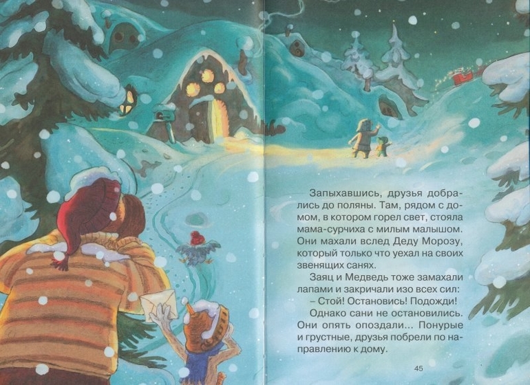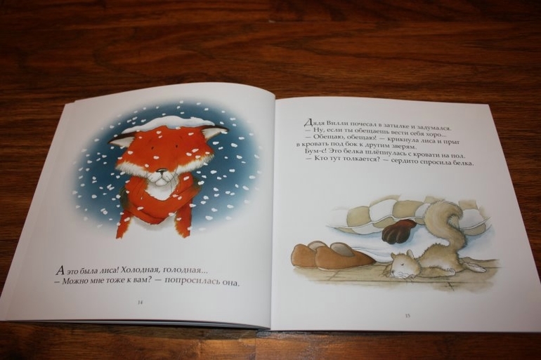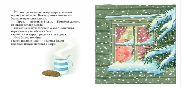 Однажды вечером ударил сильный мороз, повалил снег. Не успел дядя Вилли уютно устроиться под одеялом с чашечкой горячего какао, как в дверь постучали. Это была белка - она замерзла и вся дрожала от холода. Добряк Вилли охотно впустил ее к себе в дом, но вот ведь какое дело - вслед за белкой один за другим пожаловали зайцы, лиса, барсук, две утки, еж и целое семейство мышей! Вилли в затруднении: как разместить всех гостей и никого не обидеть?