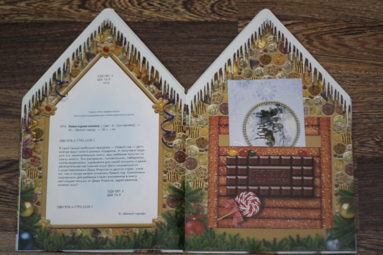 Формат необычный - без крыши 21х21см :)))) Бумага плотная, обложка пухлая, всего 36 страничек. Книга яркая, красочная. Конечно, сомнительна красота компьютерных коллажей... Но в целом - не самая плохая книга для новогоднего вечера. Вот только почитать там почти нечего - готовьте заранее стихи или сказку :))))