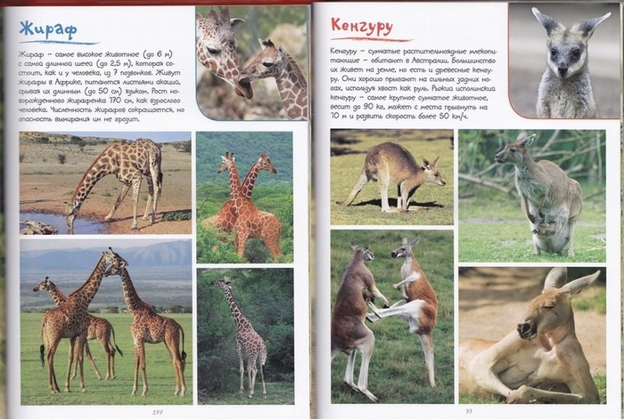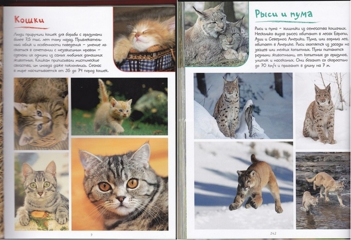 "Моя большая книга о животных" правильно названа книгой-альбомом, но ее отнесение к среднему школьному возрасту сомнительно, всё-таки в школе уже идет нормальная классификация, а не как в этой книге. Хотя, посмотрев ее две недели, я поняла, почему ее туда отнесли ))) Этот увесистый том читался нами и на диване, и на коленях, и на стуле, в результате немного надорвался корешок от тяжести. А школьник среднего возраста сидел бы и читал аккуратно в кресле или на письменном столе ))) Но фотографии шикарные, дети смотрят с удовольствием! Я и сама узнала нескольких новых животных. Покажу несколько любимых (на этот раз мною) кошачьих и жирафа с кенгуру.![]()