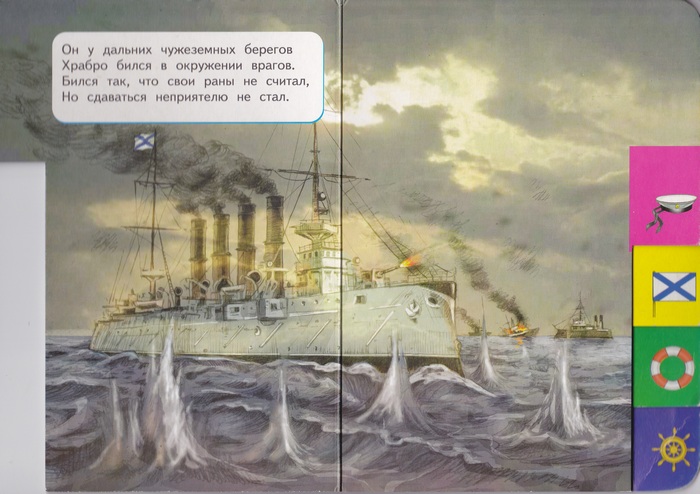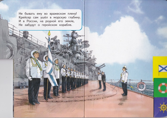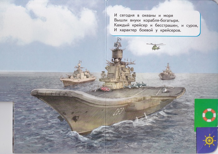 Следующий разворот сначала поверг меня в недоумение - какой же это крейсер, такие все правдоподобные рисунки и тут нА тебе?! Это же самый натуральный авианосец! Я даже расстроилась из-за несоответствия. Но хватило сообразительности залезть в интернет. И надо же, забив словосочетание "авианесущий крейсер", я сразу получила ссылки именно на "Варяг"! Зря я так плохо подумала о художнике, всё как по правде )))Справка: «Варяг» - тяжёлый авианесущий крейсер, а после демонтажа ударного вооружения - авианосец. Принадлежал ранее СССР и Украине, а в настоящее время состоит на вооружении КНР.![]()