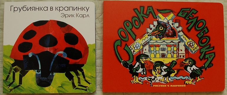 Следующими в ряду наших домашних новинок идут "Грубиянка в крапинку" Эрика Карла и "Сорока-белобока". Обе книжки на ламинированном картоне, качество отличное. Грубиянку взяла из-за разноразмерности страничек, но она не так увлекла детей, как Гусеница.Наверное, в дырочках самый смак ))). Отложила на попозже, пальчиковых тренажеров достаточно, будем потом полноценно читать как "пласт иноземной культуры".![]()