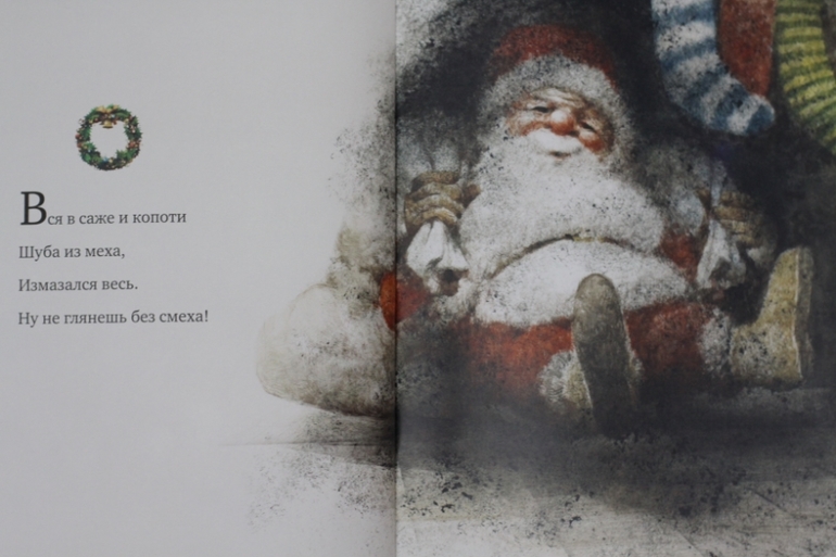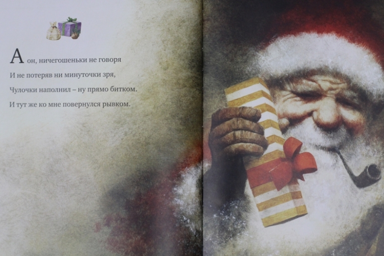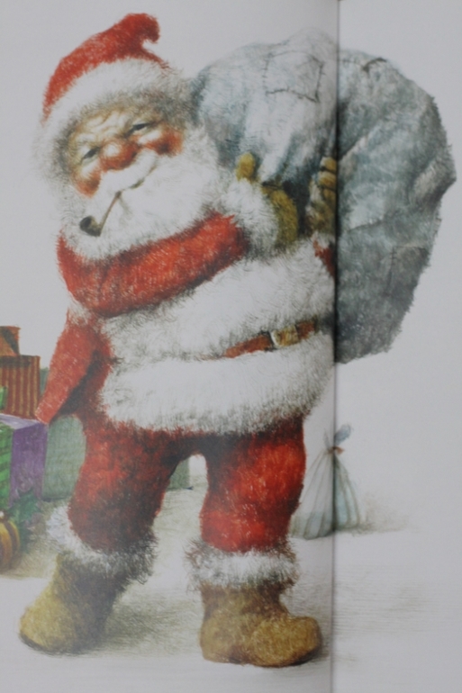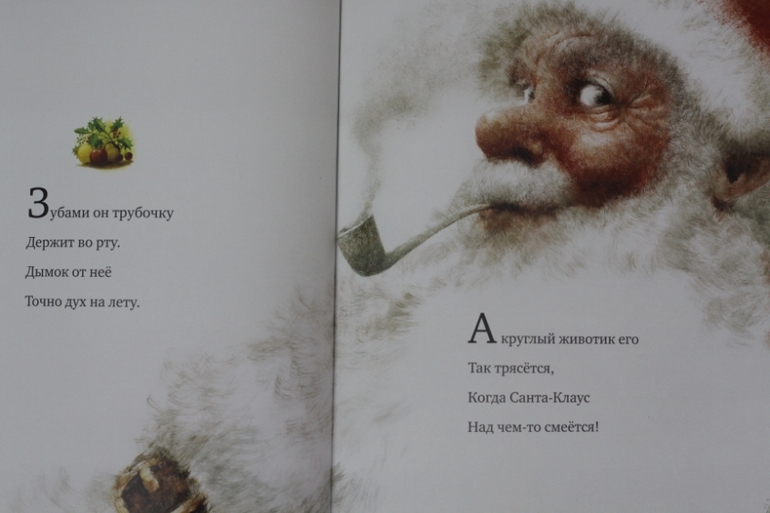 Так вот... На нескольких иллюстрациях (точнее на трех) Санта-Клаус изображен с трубкой, да и в самом стихотворении упоминается "Зубами он трубочку держит во рту. Дымок от неё точно дух на ветру". А ваши дети не задавали вам странные вопросы после этого? Я вроде бы не акцентировала внимания, но вот зацепился же их взгляд за эту трубку... Хорошо ещё хоть трубка - в жизни с ними мы может и не столкнемся.