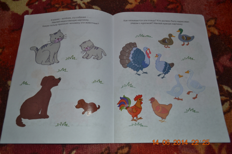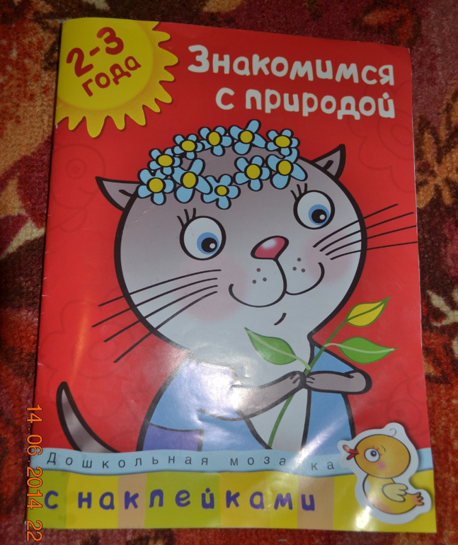 Далее идет книга из серии книг Земцовой О.Н., которых у нас очень много и которые моя дочь просто обожает! Постоянно пристает ко мне:"Давай заниматься!". Это книга называется "Знакомство с природой". В ней ребенок изучает растения, животные, клеит тематические наклейки. В целом, полезная книга. Вот ссылка на нее тут