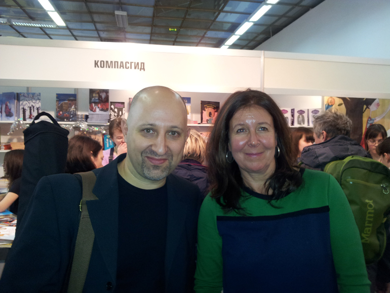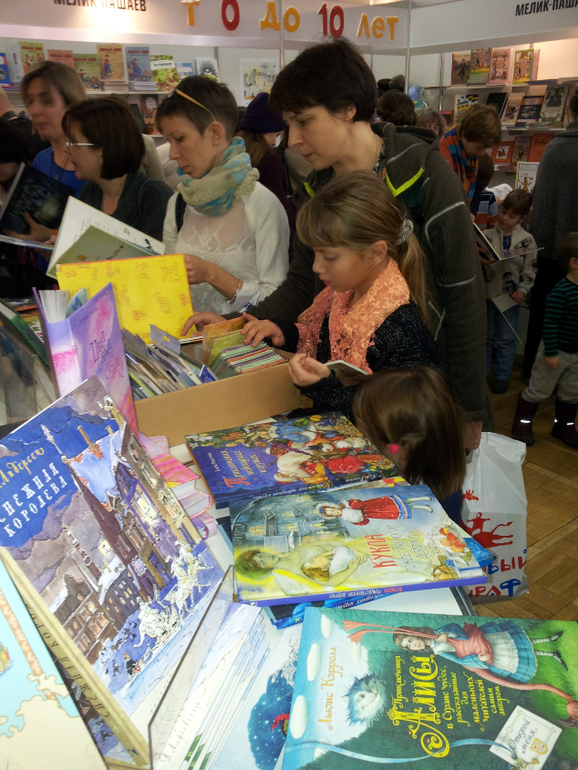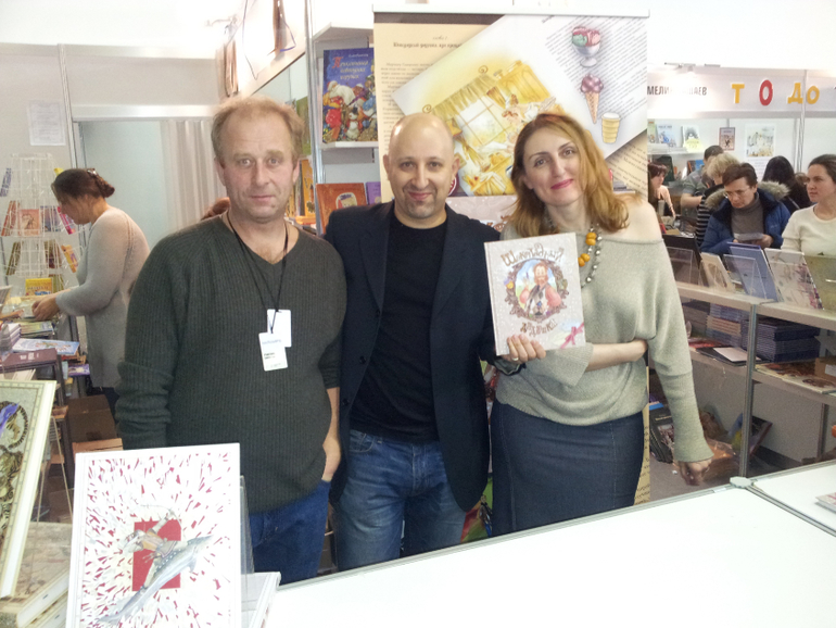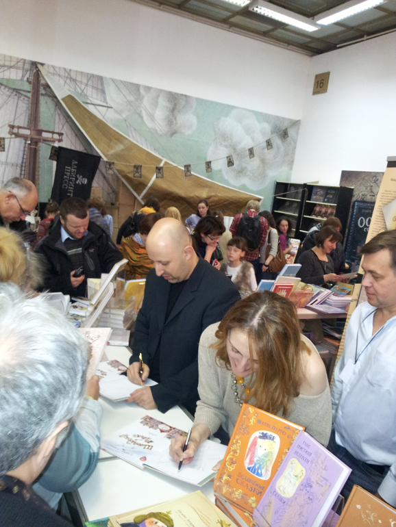 Вчера 29 ноября, на стенде издательства "Речь" прошла презентация книги "Шоколадный дедушка" Абгарян-Постников. На презентацию пришли: Виктория Кирдий (художник), Ирина Трухина ( критик детской литературы), Леонид Янковский ( директор изд. "Речь"), Марк Тарловский ( детский писатель), и классик немецкой детской литературы — Зильке Ламбек. За час авторы подписали около 200 экз книги.