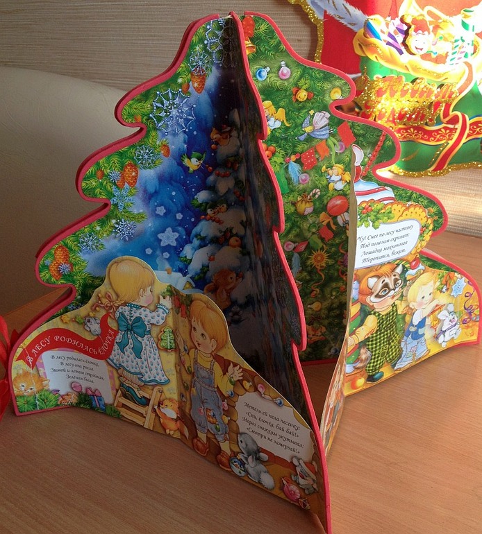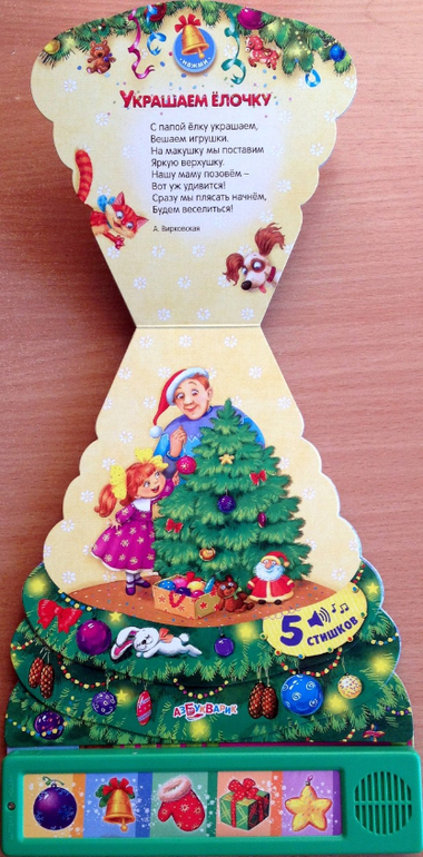 Книга для родителей, которым лень читать. Сделана в форме елочки, каждый уровень - страничка со стихотворением. Внизу кнопки, нажимая на которые вы можете эти стихи услышать. Они нам с Ваней нравятся очень. Особенно последний, про мишку, мы слушаем часто.