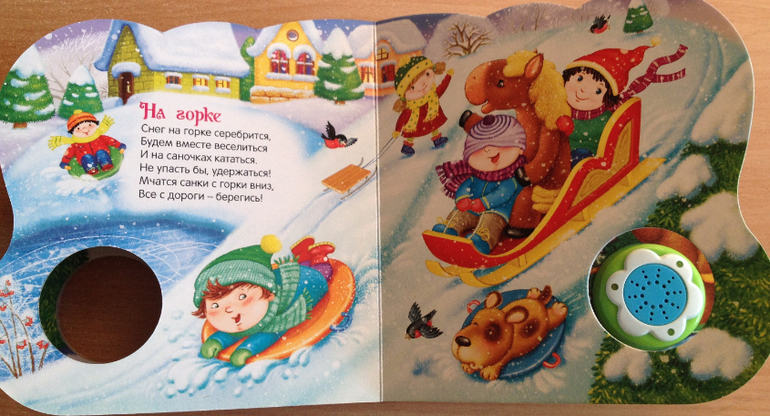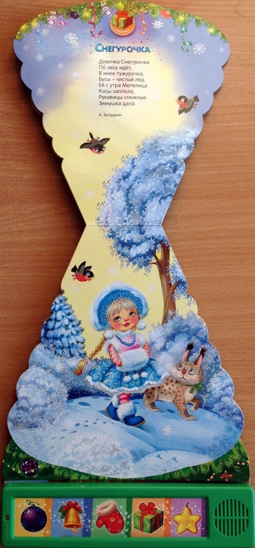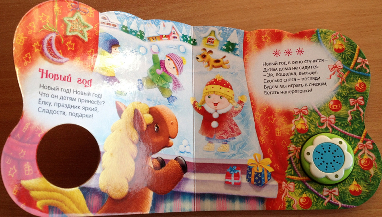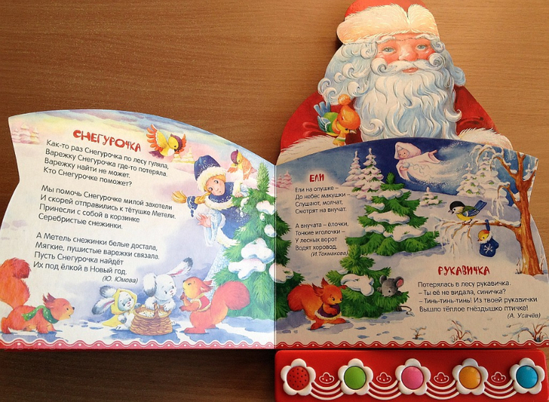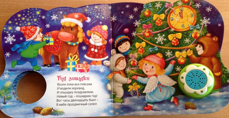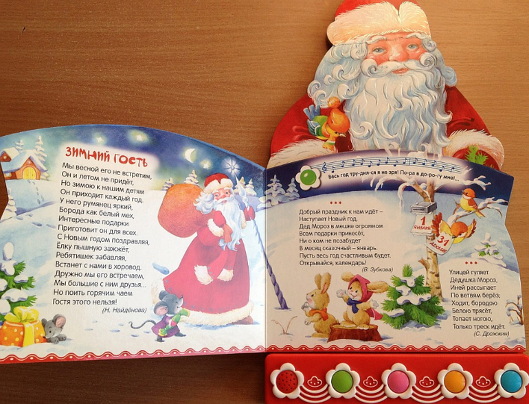 Каждый вечер перед сном мы устраиваем дискотеку под музыку из этой книги! В ней целых 4 песенки: "Песенка Деда Мороза", "Расскажи, Снегурочка…", "Рождественская песенка" и "Дед Мороз". Честно говоря, до стихов мы так и не дошли, стоит взять книгу в руки, Ваня нажимает кнопку и начинает танцевать. Хотя мне очень нравятся рисунки и стихи (их написали многие известные детские поэты), надеюсь когда песни немного надоедят, дойдет очередь и до поэзии.