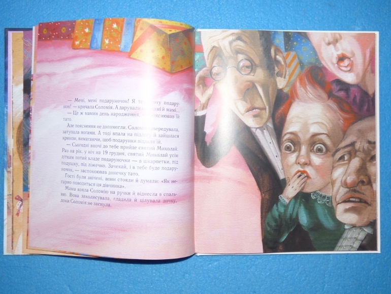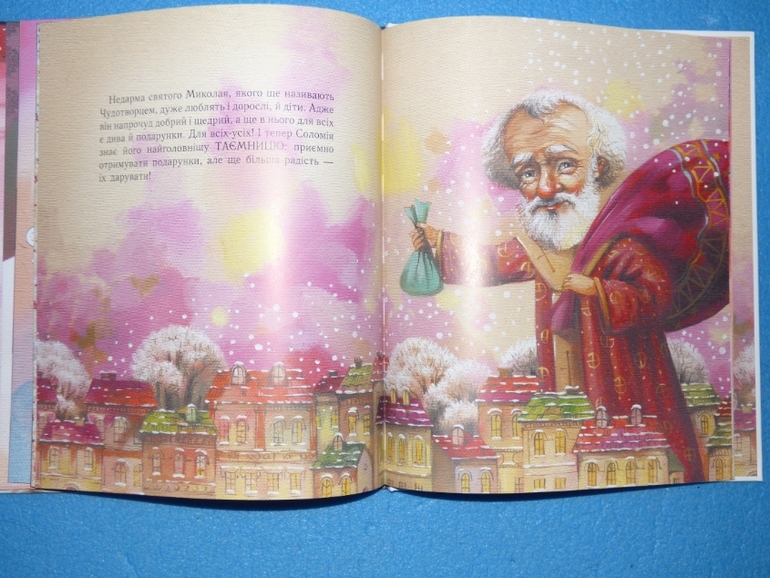 В небольшом городе, в котором живут различные животные, насекомые, люди и машины(этого я не поняла: трамваи и троллейбусы живут в городе...). живет девочка Соломия. События происходят перед новогодними праздниками. И в это же время еще одно событие, праздник, ДР мамы Соломии. К ним приходят гости и дарят много подарков маме. Соломия начинает завидовать маме и кричать, что тоже хочет столько же. Ее уносят в другую комнату и она засыпает. Проснувшись среди ночи у нее наступает прозрение и Соломия осознает, что поступила плохо и она принимает решение сделать на Мыколая подарки родителям. На утро все счастливы, т.к. каждый получает подарок. А главное, что подарки для родителей сделала сама Соломия, самостоятельно.