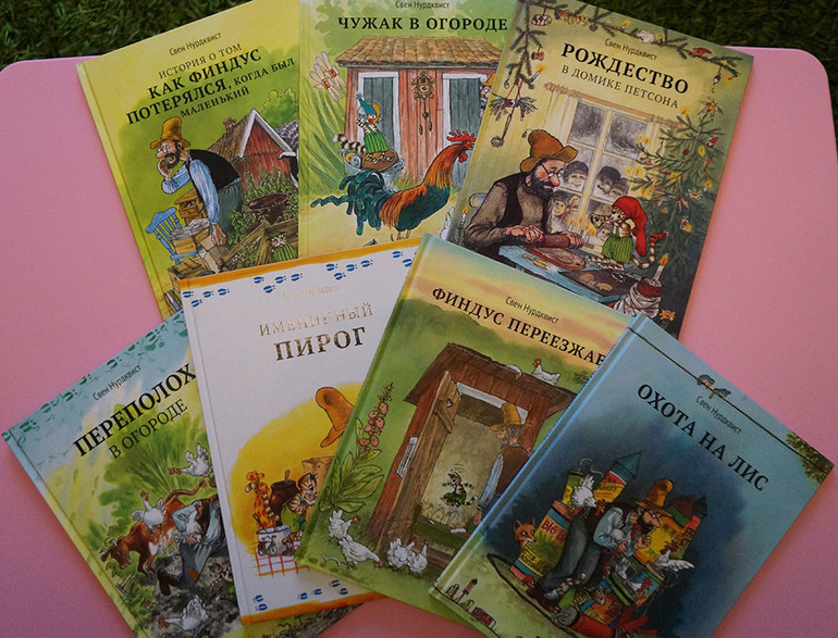 Первыми на розовой дорожке появляются Петсон и Финдус в семи книгах. Над покупкой недостающих в серии еще пока думаю. Прочитала для ознакомления одну "Как Финдус потерялся". Понравилось. Деткам должно быть интересно.