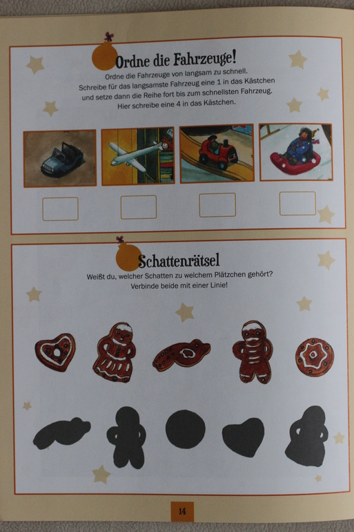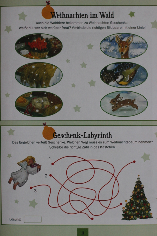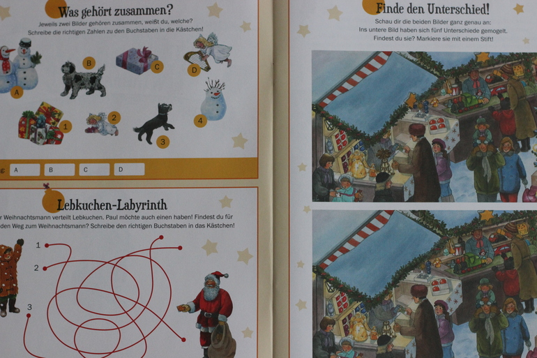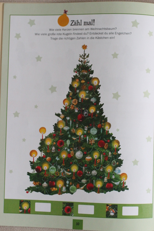 Первый набор от Анны Сьюз, в коробочке на липучке, в комплекте: книга для рассматривания Рождественская, тетрадь с заданиями и брошюрка с рассказами на немецком языке (мы пока и на немецком не можем Кириллу читать, и вообще не доросли до это брошюры, оставляем на будущее). А сама книга и тетрадь как раз нам по возрасту)