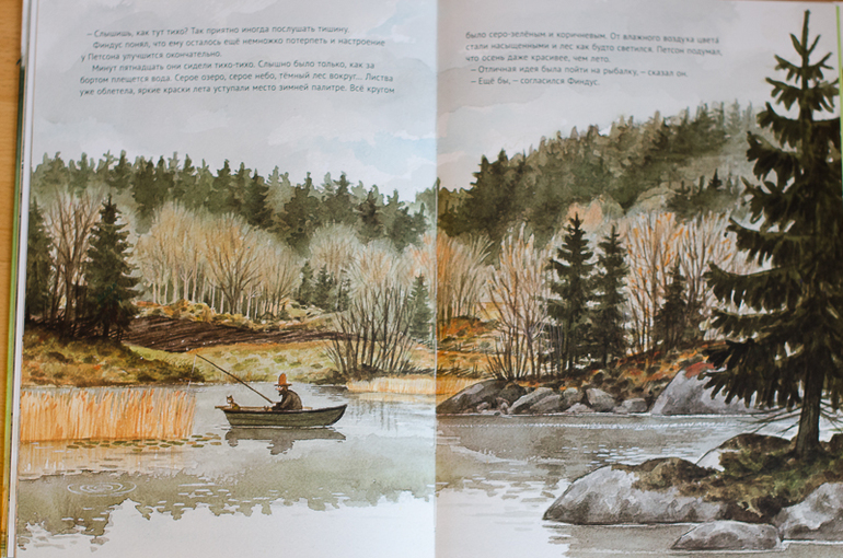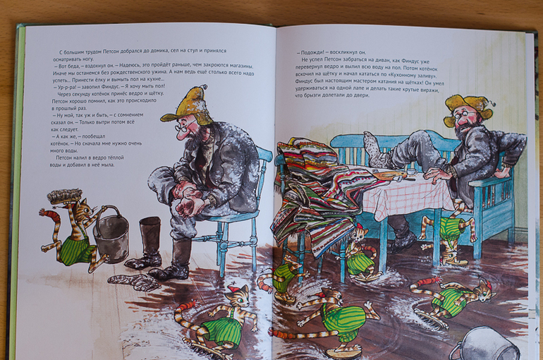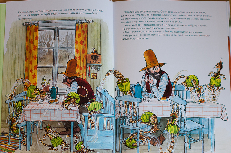Рисунки живые и очень динамичные. На них не статичный рисунок, а именно динамика - ведь котенок все время в движении, да и Петсону теперь не приходится сидеть на месте.
