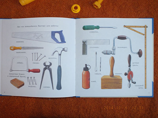 А еще там есть список всех инструментов, которые пригодились бобру. Все они нам знакомы и в том или ином виде у ребенка имеются. У него даже есть свой ящик для инструментов. Хочу еще на НГ ему мастерскую подарить. В поиске.