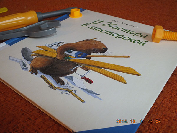 Конечно, это книжки про известного в среде книголюбов бобра Кастора. Нас любовь эта тоже не обошла стороной, очень долго мы любили печь с этим замечательным бобром пирог, а вот теперь купили книгу "У Кастора в мастерской".