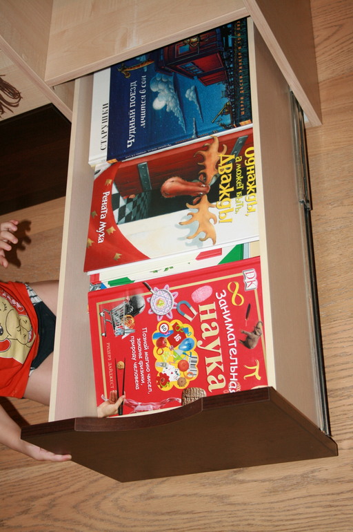 На всякий случай между полками есть дополнительная металлическая опора - "нога", благодаря которой я не боюсь обрушения полок под тяжестью книг :) Поскольку за "ногу" добраться тяжело, там лежат дорогие или взрослые издания, то, что сейчас нам точно рано.