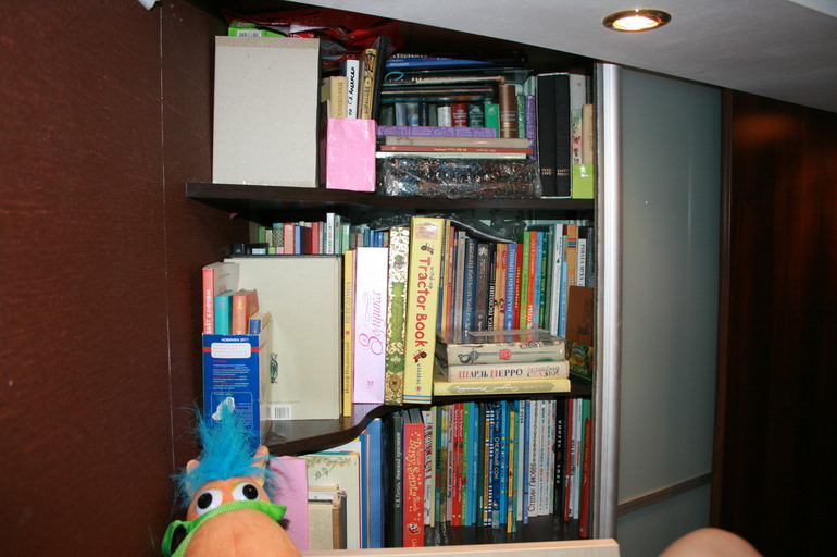 Верхняя полка - моя, там хранятся книги с илл.Трауготов. Остальное либо дочка сама достает, либо меня просит помочь.