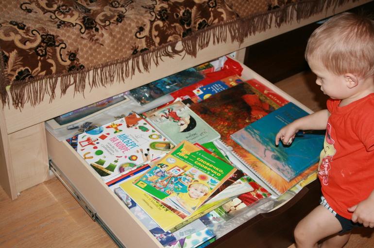 Есть еще одно место в комнате, где хранятся книги - выдвижной ящик под кроватью: