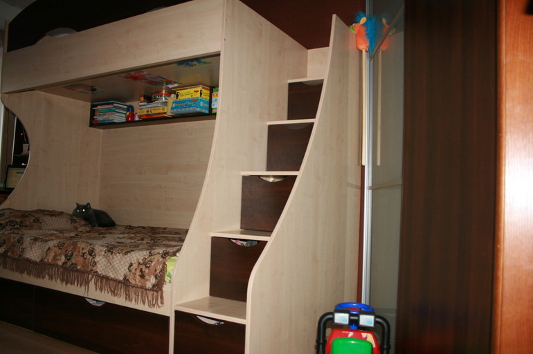 Слева виднеется мой рабочий стол с ноутбуком. Кот Хаммер сверкает глазами с нашей кровати. Внизу сплю я с сыном, поэтому небольшая полочка предназначена для книг-картонок, игр именно с малышом. Он сам дотягивается до всего и берет что ему вздумается. Ступеньки-ящики ведут на второй этаж - там спит дочка. И слева вы видите книжный шкаф собственной персоной :) Это он же, вид от окна: