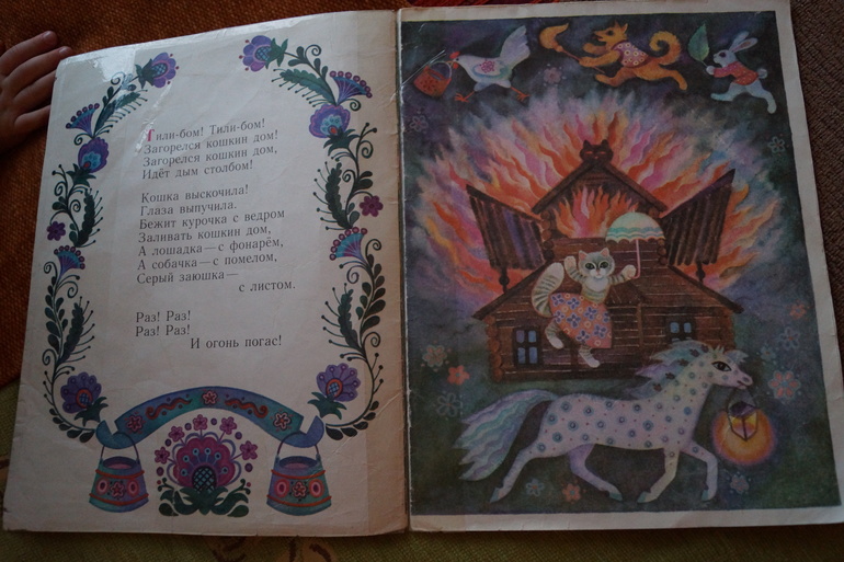 Мне очень нравится "Кошкин дом". В ней как раз полный текст потешки "Загорелся кошкин дом". В остальных наших книжечках он обрезан.