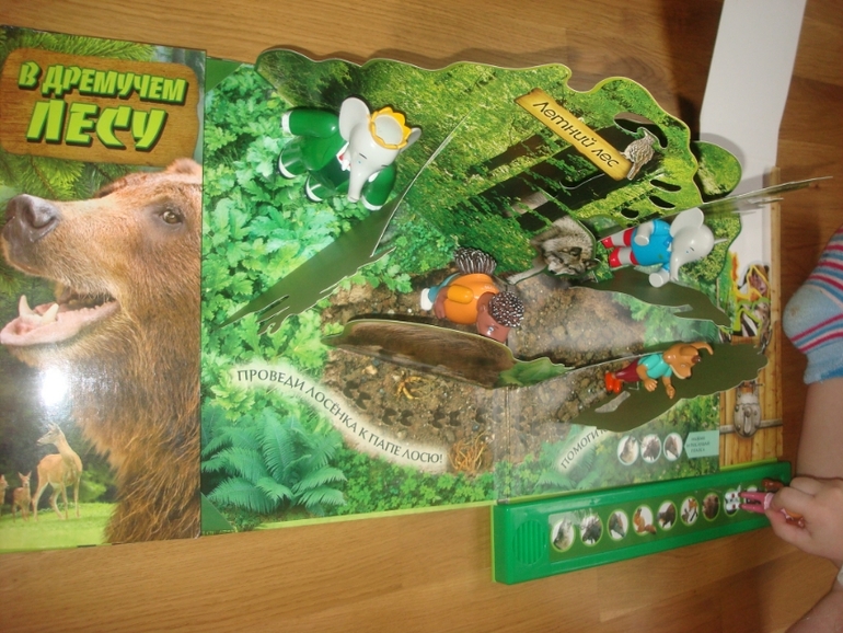 Со своими друзьями Маша проводит экскурсию по лесу, знакомит их с его обитателями. В лесу они попадают в различные ситуации. Вот например одна из них (точнее её суть), подслушанная и подсмотренная мною, когда я фотографировала книги для данного поста, а она естественно, увидев данную книгу благополучно у меня её забрала.