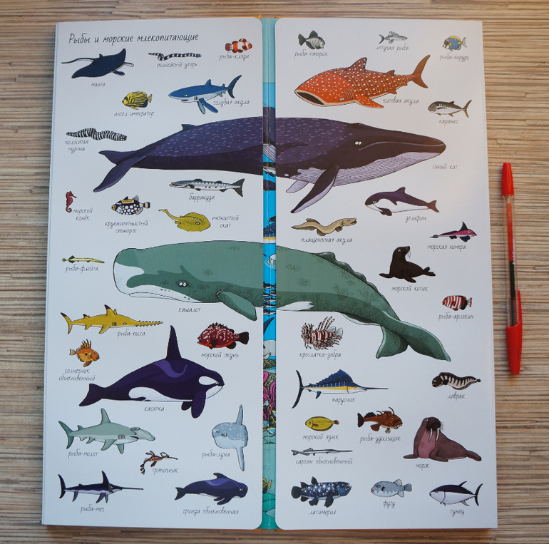 Всего в книге 5 тем: птицы, рыбы и морские млекопитающие, млекопитающие, рептилии и земноводные, насекомые и паукообразные. На некоторых страничках появляются забавные человечки.