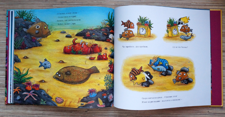 Я как-то не сразу прониклась текстом. Но чем больше читаю - тем больше нравится. Очень красивый, музыкальный перевод Марины Бородицкой. История про маленькую рыбку, которая любила приврать (ну, то есть, сочинять истории)) Забавный игровой момент - повторяющееся "Тюлька! Тюль-ка! Тюльки в классе нет." В общем, читаем часто и с удовольствием. А недавно были у врача, рассматривали аквариум и тоже искали в нем Тюльку, забавно ))) Несколько разворотов: