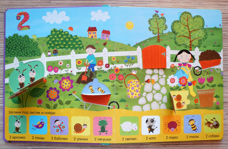 Несколько разворотов, каждый посвящен среде обитания животных. На каждом развороте - открывающиеся створки с изображением животных, которых нужно найти внутри: