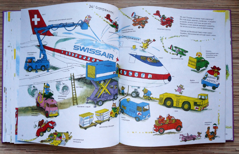 Мне очень понравилась стилистика иллюстраций! И еще интересный момент: есть как развороты с отдельными предметами, которые подписаны, так и ситуационные, есть что поразглядывать. Книга большого формата, очень плотные картонные страницы, ламинированные. Красивая книга. Развороты: