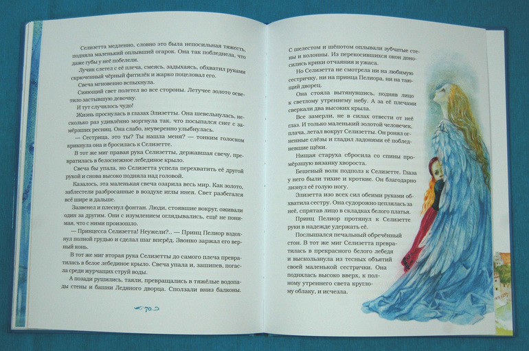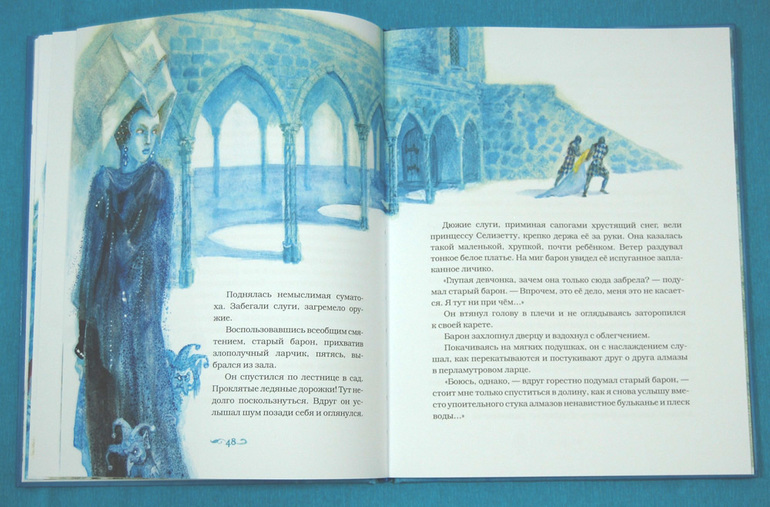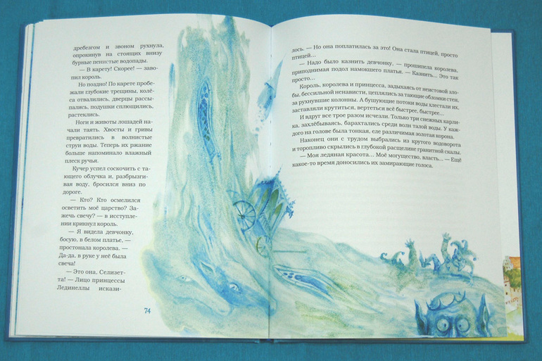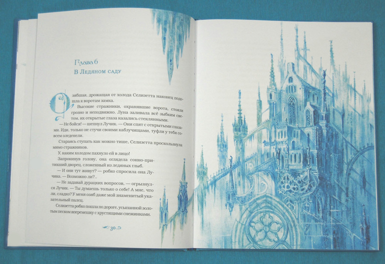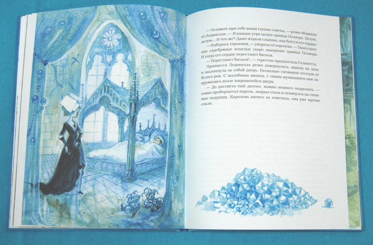 Сказка проиллюстрирована работами талантливой художницы Анны Власовой. Ей удалось очень достоверно изобразить хрустально-звенящее Ледяное царство, величественный дворец короля Ледингора, созданный из глыб голубого и белого льда, надменную принцессу Лединеллу и, на фоне всего этого вечного холода, - добрых, живых людей с горячими сердцами и теплой душой.