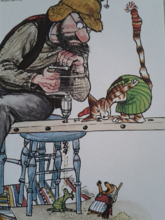 Вот и меня накрыла волна ПЕТСОНО-мании. Это первая книга , но я уверено, что не последняя. Думаю поторопилась я с ее покупкой, но уж больно мне хотелось посмотреть на этого веселого кота и его старичка вживую. История добрая, рождественская.. Так мало сейчас вокруг таких вот людей соседей, которые от чистого сердца придут на помощь в трудную минуту. Очень нравится мне юмор в иллюстрациях Нурдквиста. Долго всматривалась в конструкцию поддержки ноги Петсона: перебинтована, примотана к стулу , который вставлен в сапоги.
